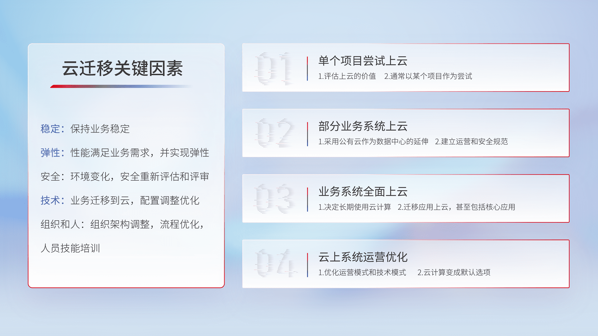 结合实际业务,,从规划设计、、、、云平台选型、、云原生改造、、数据迁移、、集成交付,,,迁移全过程为客户识别最佳上云路径,,,做好风险识别管理,,,,设计网络架构、、身份权限、、、、安全审计合规、、、操作审计、、日志审计、、监控告警策略、、、、多站点容灾设计等,,,对云上基础设施进行整体规划,,提升IT治理水平,,,,以满足弹性、、高可用、、高性能的需求。。。。