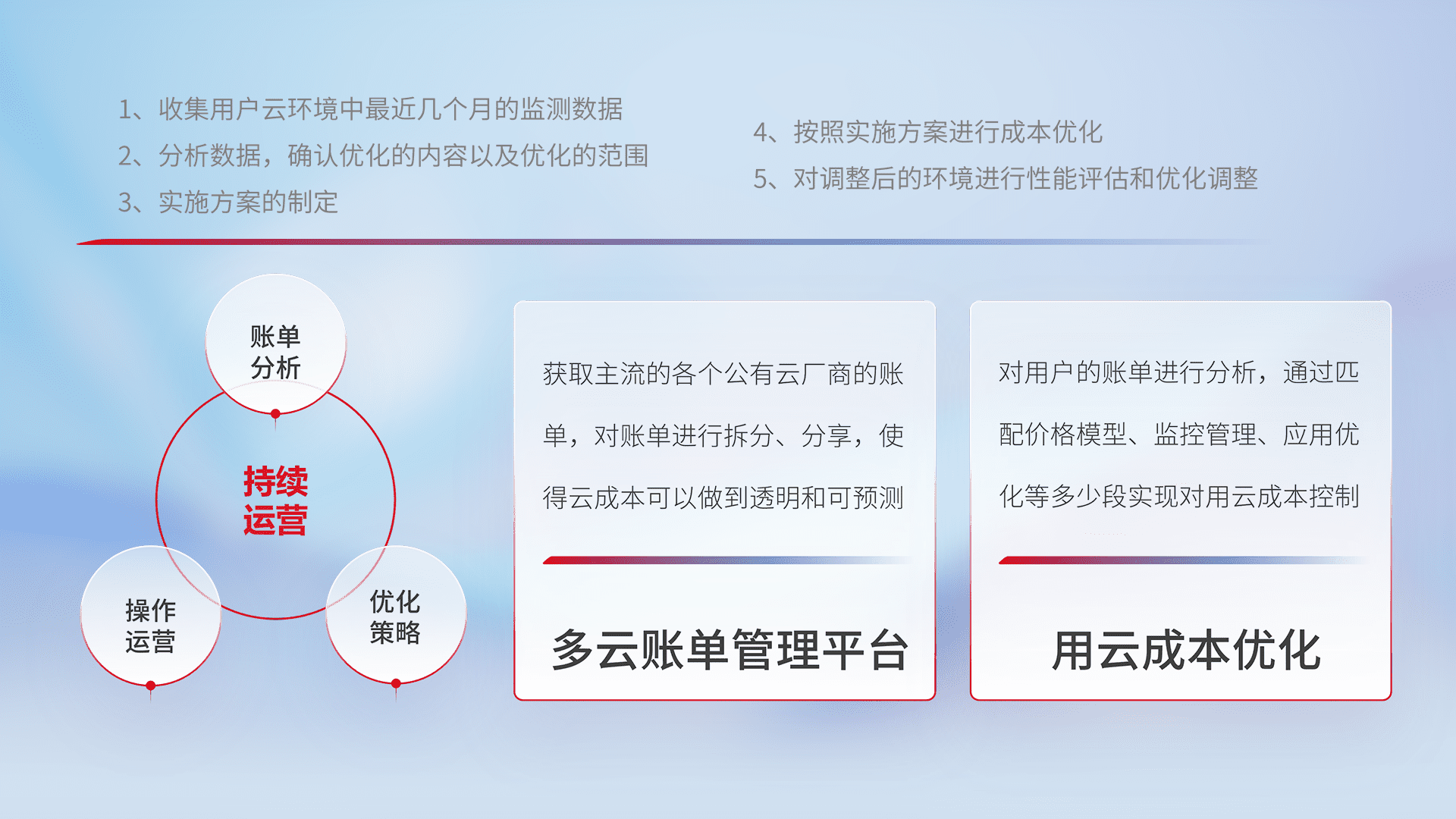 通过多云纳管,,以统一的资源数据模型把客户的云资源进行抽象和封装,,进而实现对多云资源的统一操作,,,,保障云资源管理的可靠性、、、稳定性与可用性。。。量身定制化运维内容,,,配置、、开发运维、、补丁管理、、、、备份、、监控、、认证和访问管理、、审计和日常巡检等,,,保障在用云过程中的可靠度,,,,稳定度以及高可用率。。。。